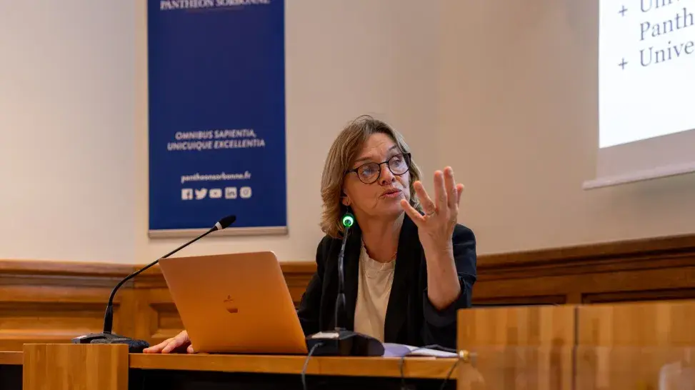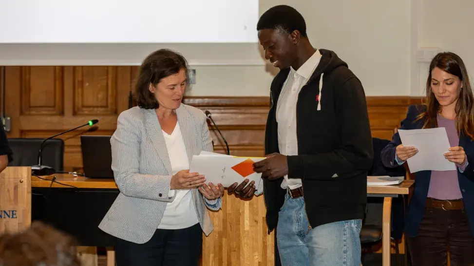 Anciens et nouveaux ambassadeurs avaient rendez-vous au centre Panthéon mardi 24 septembre pour célébrer la mandature de la promotion 2023-2024 et accueillir la suivante. « Una Europa est le grand défi de notre université. Vous allez participer à un projet collectif d’une très grande ampleur », introduit Christine Neau-Leduc, présidente de Paris 1 Panthéon-Sorbonne. « Les plus prestigieuses universités européennes sont réunies au sein de cette alliance pour que nous puissions tous ensemble porter des projets. » En quatre ans, des nouvelles formations et des nouvelles opportunités de mobilités ont vu le jour. « Je suis très fière de votre engagement. Sans vous et votre implication, nous ne pourrions pas aller aussi loin. » Les anciens ambassadeurs se sont ensuite avancés pour recevoir leur certificat d’engagement.
