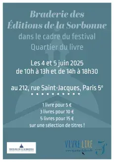 Pour la 4e année consécutive, les Éditions de la Sorbonne ont le plaisir de participer au Festival Quartier du livre, et proposent dans ce cadre une grande braderie de leurs ouvrages.